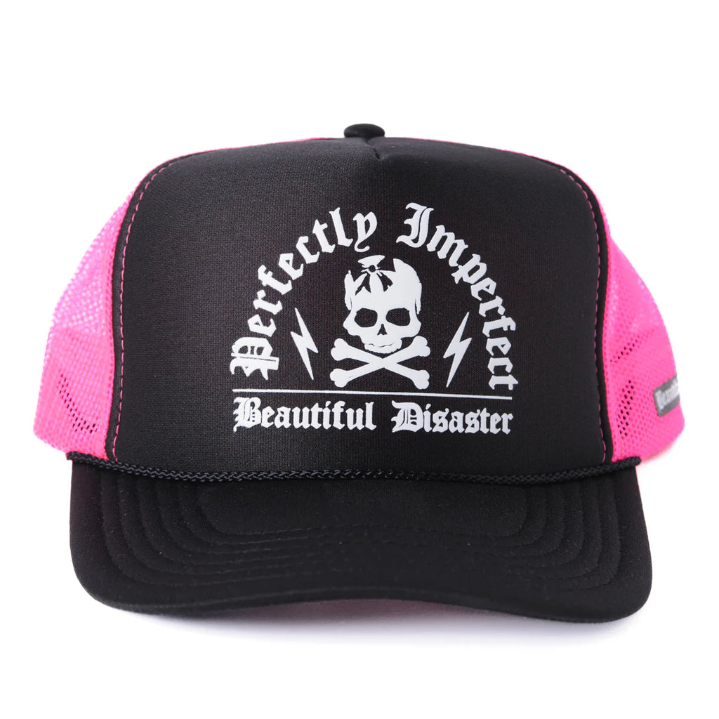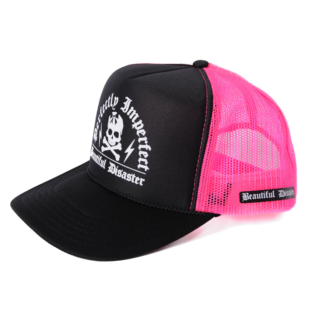 Black and Pink Perfectly Imperfect Trucker Hat – a vibrant expression of individuality and self-acceptance.